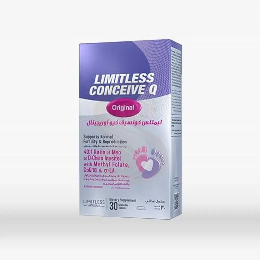 LIMITLESS CONCEIVE Q 30 CHEW. TABS. يحتوي على myo-inositol + d-chiro-inositol + methyl folate + co q10 + alpha lactalbumin. مصمم لـ multivitamin.